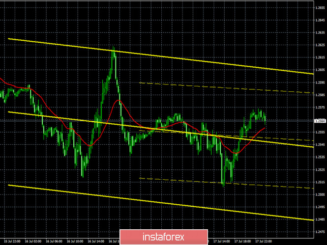 На 15-минутном таймфрейме оба канала линейной регрессии продолжают быть направленными вниз, что в принципе соответствует общей тенденции, сложившейся на более старшем графике. Что касается последнего отчета COT, то он показал минимальные изменения по сравнению с предыдущим. До 14 июля(конечная дата отчета) британская валюта преимущественно продолжала укрепляться, поэтому не удивительно, что некоммерческие трейдеры(профессиональные игроки) продолжали открывать Buy-контракты в количестве 2811. Контрактов на продажу категорией трейдеров «Non-commercial» было открыто всего 182(неделей ранее еще меньше). Тем не менее, мы не можем сказать, что фунт безудержно дорожает и обязательно продолжить этот процесс. Скорее даже бычий настрой немного ослабевает, что видно и исходя из технической картины, и исходя из поведения категории «Commercial», которая активно сокращала Buy-контракты. Таким образом, последний отчет COT допускает завершение восходящего движения по паре фунт/доллар.