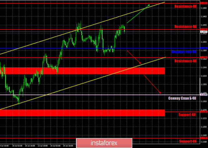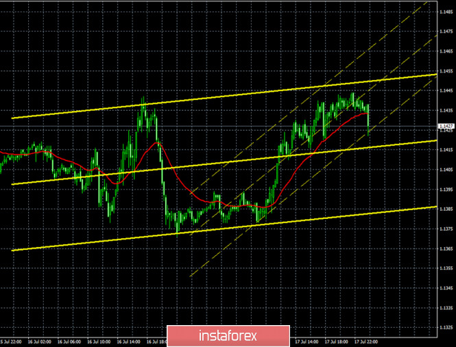 На часовом таймфрейме 17 июля пара евро/доллар в третий раз выросла к уровню сопротивления 1,1432 и в третий раз покупатели остановились около этой отметки и дальше не смогли продолжить движение вверх. Таким образом, быки остаются доминирующими на рынке, однако их сил в течение прошедшей недели не хватило на то, чтобы преодолеть уровень 1,1440. Исходя из этого, на новой неделе мы ожидаем новых попыток продолжения восходящего движения. Восходящий канал продолжает сигнализировать о восходящей тенденции, поэтому сейчас по-прежнему рекомендуется рассматривать только покупки евровалюты. В понедельник все уровни поддержки и сопротивления будут уточнены.
