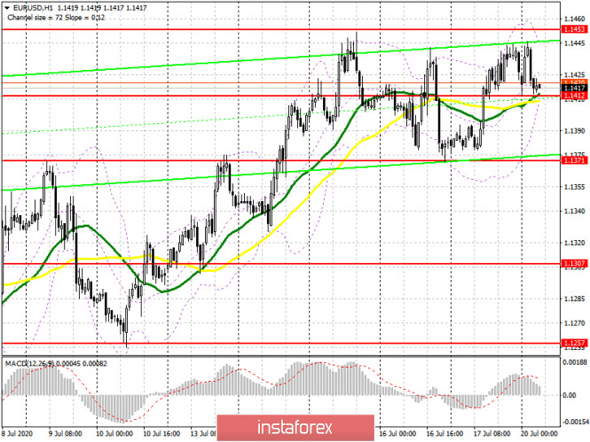 Саммит лидеров ЕС продлили еще на один день и скорей всего он вновь окажется безрезультатным, что видно по реакции пары EUR/USD, которая остается в боковом канале уже четвертый торговый день подряд. Новых позитивных фундаментальных данных, способных протолкнуть EUR/USD выше недельных максимумов также нет. Покупатели могут рассчитывать сегодня на формирование ложного пробоя в районе середины канала 1.1412, так как лишь при таком сценарии можно открывать длинные позиции и ожидать пробоя верхней границы 1.1453. Только закрепление выше 1.1453 образует в евро новый бычий импульс, способный на продолжение восходящего тренда от 30 июня этого года, что откроет прямую дорогу на максимумы 1.1485 и 1.1514, где рекомендую фиксировать прибыль. При отсутствии активности со стороны быков на уровне 1.1412, лучше всего отложить длинные позиции до обновления нижней границы бокового канала 1.1371, так как оптимизма у покупателей евро может поубавиться в связи с провальным саммитом ЕС. В случае слабого отскока вверх от уровня 1.1371, рынок может полностью переместиться на сторону продавцов, поэтому на новые длинные позиции лучше всего рассчитывать после обновления минимума 1.1307.