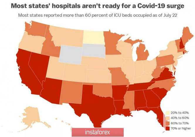 Суточный показатель смертности от коронавируса в США снова превысил тысячную отметку – хуже ситуация была только в апреле, когда ежедневно регистрировали по 2 тысячи летальных случаев. Что касается общей эпидемиологической ситуации в стране, то здесь никаких позитивных просветов нет. В начале этой недели доллар попытался восстановить свои позиции на фоне резкого спада заболеваемости – в воскресенье было зарегистрировано 45 тысяч инфицированных, тогда как на минувшей неделе суточная планка не опускалась ниже 60 тысяч. Но, как впоследствии оказалось, воскресный спад был обусловлен «эффектом выходного дня»: в понедельник этот показатель вырос до 61 тысячи, во вторник – до 65 тысяч, а снова превысил 70-тысячную отметку (+71 967 за сутки). Наиболее сложная ситуация сложилась во Флориде: там каждый день выявляют почти по 10 тысяч новых случаев заражения. Эпицентр эпидемии переместился в южные и некоторые западные штаты страны.
