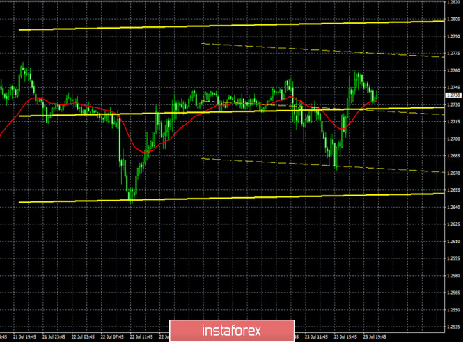 На 15-минутном таймфрейме младший канал линейной регрессии развернулся вниз, сигнализируя о возможной смене тенденции. Однако подтверждения этому пока нет ни на этом графике, ни на более старшем. Последний отчет COT(Commitment of traders) показал, что профессиональные трейдеры(категория «Non-commercial») продолжала открывать Buy-позиции, но уже не так рьяно, как прежде. Всего было открыто всего 2,8 тысячи контрактов. Однако, противодействующая категория коммерческих трейдеров(те, которые выходят на валютный рынок с целью приобретения валюты для своей коммерческой деятельности) в течение той же отчетной недели закрывала и Buy-контракты, и Sell. В период с 15 по 21 июля британская валюта все равно продолжала дорожать. А значит, что новый отчет COT может продемонстрировать новое усиление бычьего настрой среди трейдеров. После 21 июля фунт стерлингов начал дорожать еще сильнее, поэтому мы ожидаем увидеть в следующих отчетах увеличение нетто-позиции. Если этого не произойдет, то мы будем считать, что крупные трейдеры готовятся к смене тренда по паре на нисходящий.