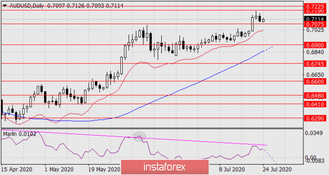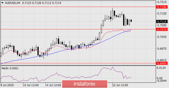 На графике четырёхчасового масштаба сигнальная линия Марлина пытается войти в зону отрицательных значений. После этого цене будет уже значительно легче преодолеть поддержку линии Крузенштерна, в районе 0.7075. Закрепление цены под данной линией отправит котировку к линии Крузенштерна уже на дневном масштабе, к уровню 0.6900.