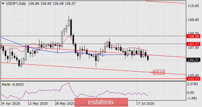 Осциллятор Марлин также усилил снижение, теперь ждём цену у поддержки вложенной линии ценового канала в районе отметки 105.63. Преодоление линии позволит цене снизиться к целевому уровню 105.15.