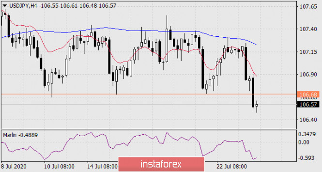 На четырёхчасовом графике цена с разгона пробила сигнальный уровень 106.68, Марлин снижается в зоне понижающейся тенденции. Ждём пару USD/JPY у обозначенной цели.