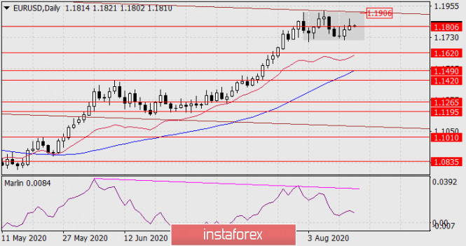 Вчерашним ростом на 28 пунктов евро углубился в широкий диапазон неопределённости и блуждания 1.1710-1.1906. На графике дневного масштаба осциллятор Марлин направлен вниз, цена находится в точности на целевом уровне 1.1806. Цена вполне может отработать верхнюю границу ценового канала на отметке 1.1906 без критического разворота осциллятора вверх. Цена может даже перейти эту границу и по осциллятору не будет сформирована двойная дивергенция, чем и создаётся повышенная неопределённость по валютной паре.