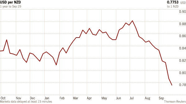 Kiwi swoons after central bank sells NZ$521m, FT, 29 Sep