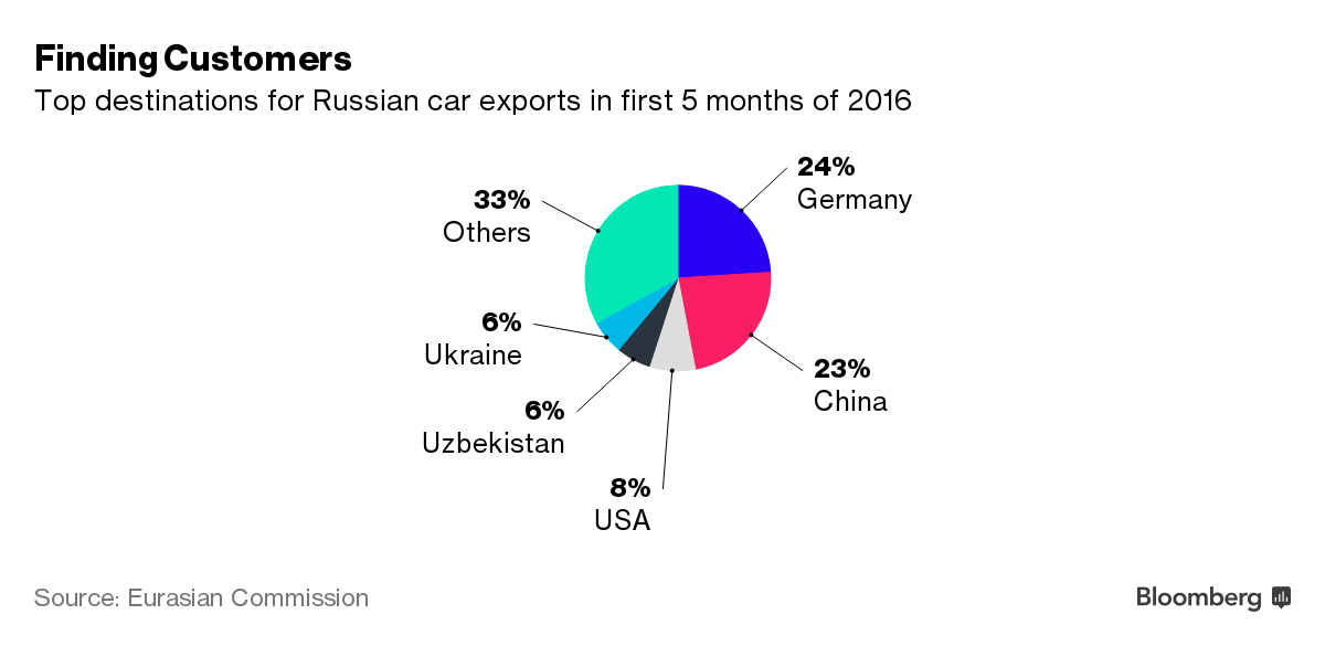 Потеряв половину своей стоимости по сравнению с курсом три года назад, более гибкий рубль помог пройти шок худшего нефтяного коллапса за целое поколение, придавая импульс бюджету и секторам от сельского хозяйства до химической промышленности. Все это зажгло искру промышленного восстановления, а также компенсировало падение внутреннего спроса. В последнем квартале Россия не показала признаков выхода из рецессии, и уже сейчас она наиболее длинная за два десятилетия. Ведущими же экспортными направлениями для машин за период между январем и маем стали: Германия, Китай и США. В PricewaterhouseCoopers LLP считают, что около 8% всех машин, проданных в России в 2015 году, были куплены на реэкспорт иностранными гражданами, в основном, гражданами Казахстана и Беларуси, которые являются членами таможенного союза с Россией.