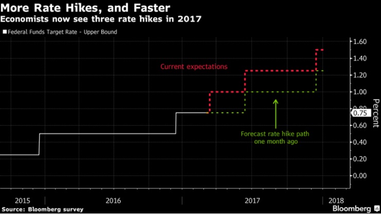 По итогам опроса Bloomberg 45 экономистов 7-8 марта средняя оценка указывала на три повышения ставок на четверть пункта в 2017 году, и фактические повышения ожидались в марте, июне и декабре. В феврале респонденты ожидали двух повышений, тогда как сейчас средняя цифра соответствует прогнозам политиков в декабре. Вероятность трех и более повышений в этом году впервые превысила порог в 50% 1 марта.