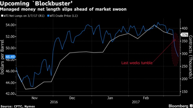 Падение нефти на прошлой неделе началось с хедж-фондов, и с текущего момента ситуация может ухудшаться. Инвесторы сокращали бычьи позиции по WTI до минимального значения за месяц, по данным Комиссии по торговле товарными фьючерсами, что происходило перед рыночной динамикой, толкнувшей цены на нефть ниже $50 за баррель впервые с декабря.