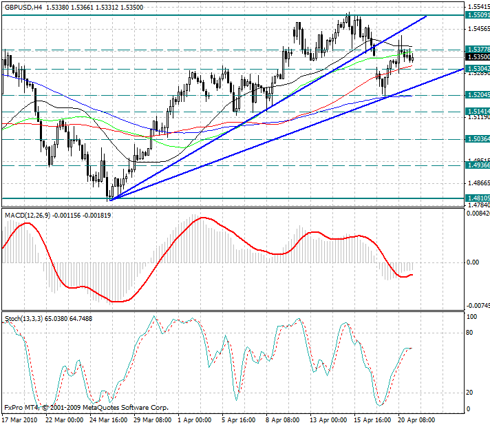Начнем с того, что наш вчерашний прогноз подтвердился - пробой уровня сопротивления 1.5340 привел к усилению бычьих настроений и ранее намеченные цели 1.5390 и 1.5430/40 были отработаны в самом начале второй половины дня вторника. С точки зрения фундаментального анализа, фунт получил сильную поддержку после того, как стало известно, что CPI в Британии вырос в марте вдвое сильнее ожиданий. Тем не менее, уже возле уровня 1.5430/40 восходящее движение замедлилось и началась консолидация в диапазоне 1.5330-1.5380, которая продолжается до сих пор...