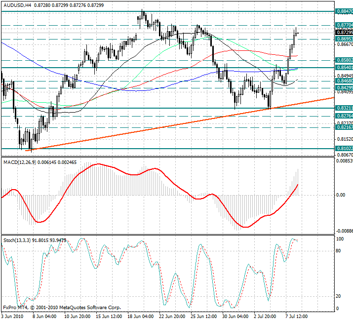 Обратив внимание на 4х часовой график, можно заметить, что на американской сессии среды был пробит сильный уровень сопротивления 0.8540/50, что привело к усилению бычьих настроений и росту австралийского доллара более чем на 200 пунктов...