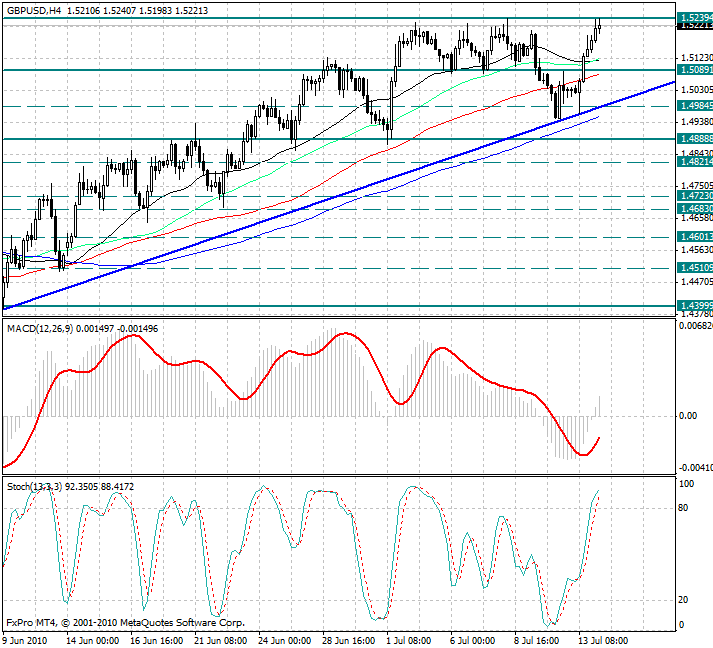 Обратив внимание на 4х часовой график, можно заметить, что последние три торговых сессии продолжались активные покупки британской валюты. С точки зрения фундаментального анализа фунт получил поддержку после публикации данных, которые указали на сильное инфляционном давление в Британии. В то же время давление на американский доллар оказала новость о том, что торговый дефицит США вырос в мае до 42.3 млрд. долларов. Тем не менее уже возле уровня 1.5240 стремительный рост фунта замедлился и началась "вялая" коррекция, которая продолжается до сих пор...