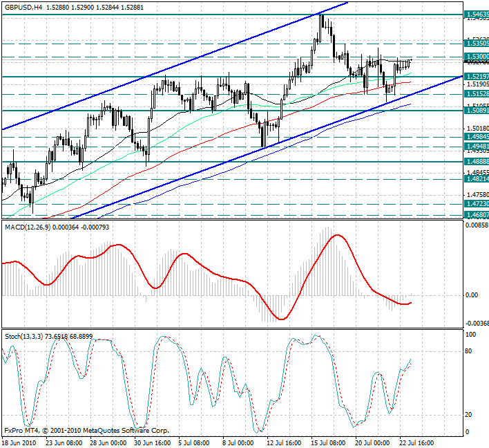 Обратив внимание на 4х часовой график, можно заметить, что на торгах в четверг пробой уровня сопротивления 1.5200/20 привел к усилению бычьих настроений и ранее намеченные цели 1.5260 и 1.5300/10 были отработаны в начале второй половины дня. Уже возле уровня 1.5300 рост фунта замедлился и началась консолидация в ценовом диапазоне 1.5250-1.5300, которая продолжается до сих пор...