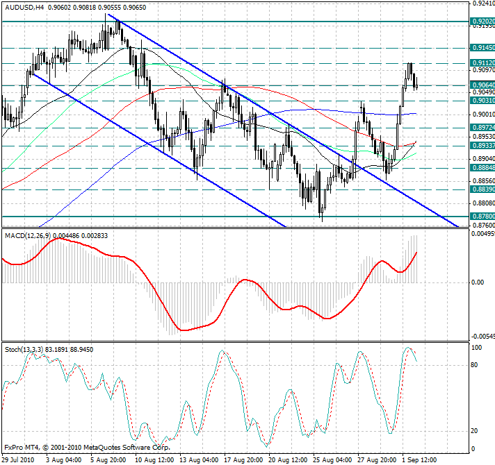 Начнем с того, что наш вчерашний прогноз подтвердился - пробой уровня сопротивления 0.9000/10 привел к усилению бычьих настроений и отработка ранее намеченных целей 0.9030/40 и 0.9070 завершилась в самом начале американской сессии среды. Стремительный рост австралийского доллара замедлился лишь возле уровня 0.9100/10, после чего началась коррекция, которая продолжается до сих пор...