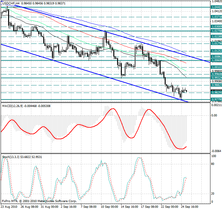 Обратив внимание на 4х часовой график, можно заметить, что краткосрочный нисходящий торговый коридор "остается в силе", но продолжается коррекция после того как активные продажи доллар/франка замедлились возле уровня поддержки 0.9780...