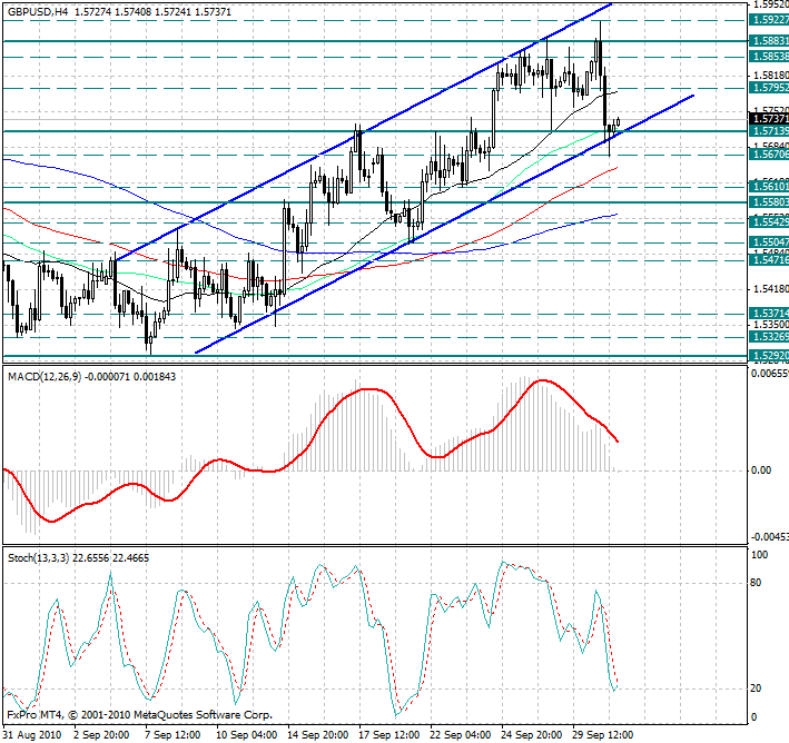 Обратив внимание на 4х часовой график, можно заметить, что на торгах в четверг быкам в очередной раз не хватило сил для пробоя сильного уровня сопротивления 1.5880, после чего началась стремительная коррекция, которая "утихла" лишь в конце американской сессии. С точки зрения фундаментального анализа, американский доллар получил поддержку после публикации ряда позитивных данных: - прирост ВВП во втором квартале составил 1.7% (первоначально правительство США сообщало о повышении ВВП на 1.6%). - количество первичных обращений за пособием по безработице в США снизилось за минувшую неделю к 25 сентября на 16К до 453K. Экономисты прогнозировали, что показатель окажется на более высоком уровне и составит 458K.