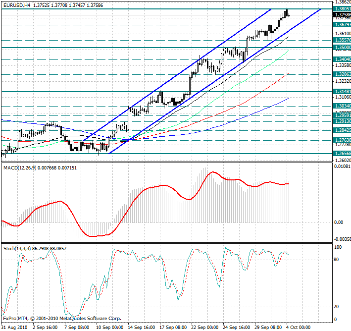Обратив внимание на 4х часовой график, можно заметить, что на торгах в прошлую пятницу консолидация в рамках ценового диапазона 1.3575-1.3680 завершилась пробоем его верхней границы, что привело к усилению бычьих настроений и ранее намеченные цели 1.3740/50 и 1.3800/10 были отработаны сегодня (в первый час торгов). Уже возле уровня 1.3800/10 стремительный рост евро замедлился и началась коррекция, которая продолжается до сих пор...