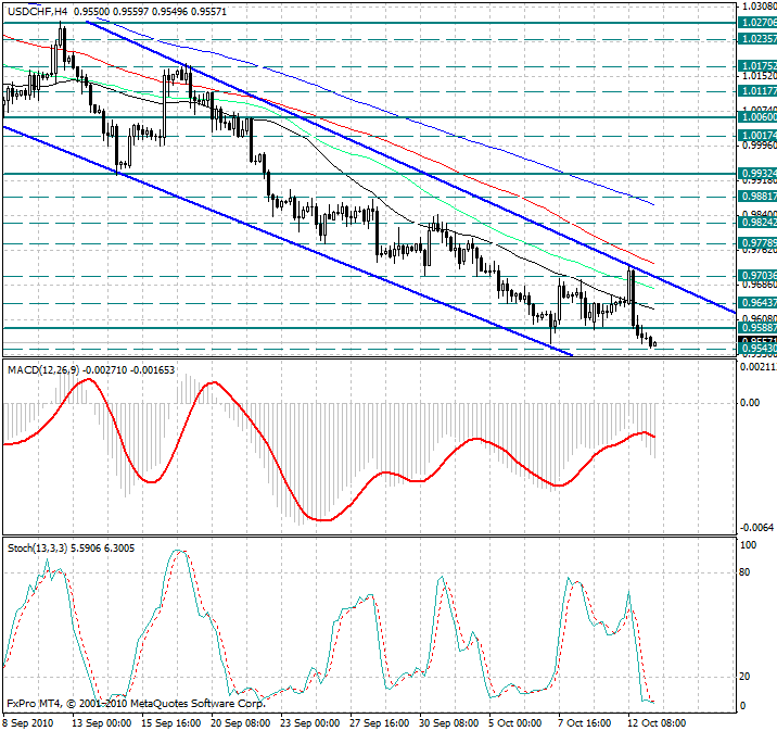 Обратив внимание на 4х часовой график, можно заметить, что среднесрочный нисходящий торговый коридор сохраняется и примерно час назад был переписан исторический минимум, теперь это отметка 0.9545...