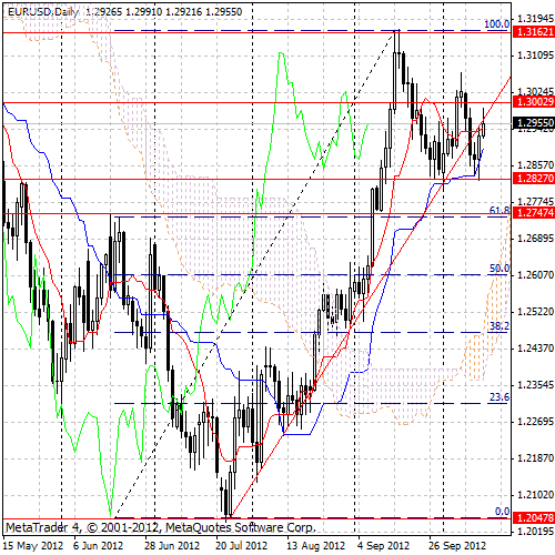 Евро в паре евродоллар вошел в боковой тренд в долгосрочной перспективе, между уровнями 1,2870-1,300. Пауза возникшая в решении европейских долговых проблем, а также снижение прогнозов международного валютного фонда не дает рынкам определенных стимулов для формирования определенной тенденции.