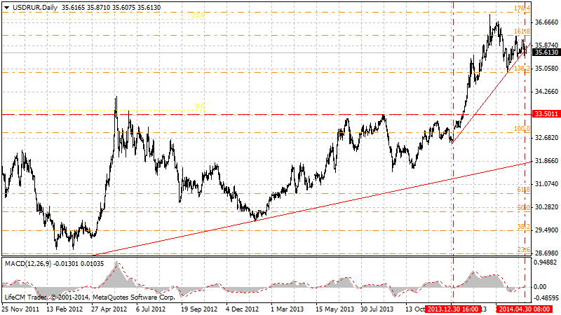 Очередная фаза бычьей активности наблюдалась в период с 27 декабря 2013 года до 3 марта 2014 года. Напомним, что за это время курс рубля против доллара полегчал еще на 14% - пара поднялась с уровня 32.46 до отметки 36.94.