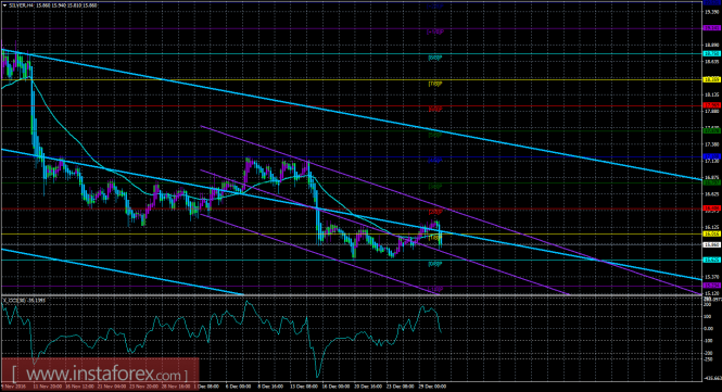 Из анализа серебра 2 января следует, что цена закрепилась ниже мувинга и может возобновить нисходящий тренд. Старший канал направлен вниз, что свидетельствует о нисходящем направлении движения глобального тренда. Младший канал также направлен вниз, что означает нисходящее движение и в менее долгосрочном плане. В данный момент цена находится ниже мувинга и ниже уровня Мюррея «1/8», что делает более вероятным продолжение нисходящего движения. Первой целью для движения вниз сейчас является уровень Мюррея «0/8» - 15,625, который уже был отработан. Если цена преодолеет этот уровень, то новой актуальной целью будет выступать уровень Мюррея «-1/8» - 15,234. Скользящая средняя направлена вбок, а цена располагается ниже нее, что сигнализирует о текущем нисходящем направлении движения. Длинные позиции станут актуальными не раньше обратного закрепления цены выше скользящей средней с целью уровень Мюррея «2/8» - 16,406. Хайкен Аши окрасил последние бары в голубой цвет, что сигнализирует о внутридневном движении вниз, таким образом, до смены направления индикатора на восходящее, открытые ордера на продажу можно сопровождать. Окрас 1-2 баров в фиолетовый цвет укажет на начало восходящей коррекции. Индикатор CCI находится около уровня 0, что сигнализирует об отсутствии какой-либо перекупленности или перепроданности инструмента.