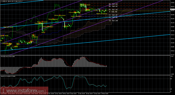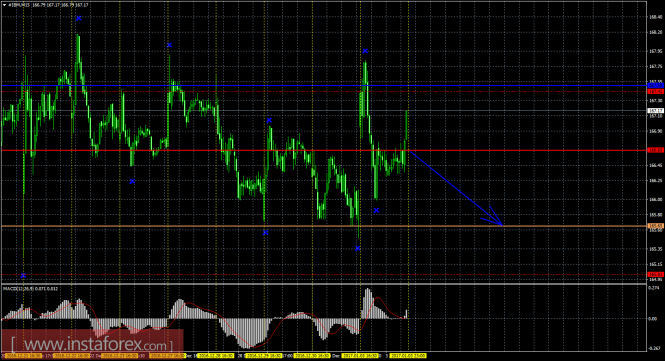 На младшем графике рекомендуется рассматривать ордера на продажу с целью 165,65 (Сенкоу Спан А), при открытии ниже Тенкан-сен (166,65), ордером Stop Loss выше 166,65. Индикатор MACD должен быть направлен вниз.