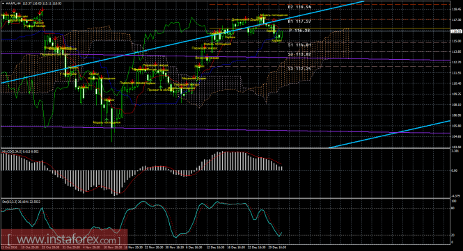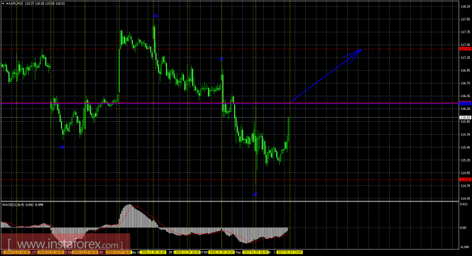 На 15-минутном графике рекомендуется рассматривать ордера на покупку с целью 117,37, при закреплении цены выше Тенкан-сен (116,30), ордером Stop Loss ниже 116,30 и при направленном вверх MACD.