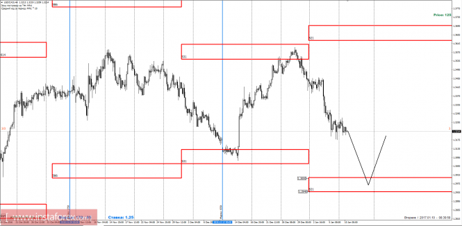Нисходящее движение является среднесрочным импульсом, поэтому любой рост пары необходимо использовать для получения выгодных цен на продажу инструмента. Уровнями сопротивления будут выступать контрольные зоны младших временных отрезков. Целью падения является месячная КЗ января 1.2940-1.3000. При достижении декабрьского минимума возможна частичная фиксация продаж, так как повышается вероятность формирования коррекционной модели.