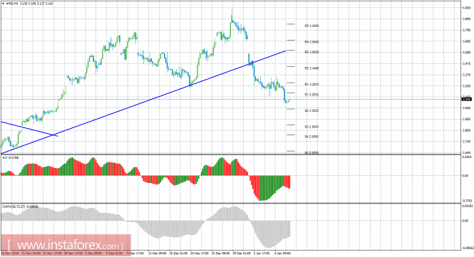 Анализ природного газа за 10 января показывает, что цена закрепилась ниже уровня S1 – движение вниз продолжается. На данный момент актуально нисходящее движение с целями уровни поддержки S2 – 3,0520 и S3 – 2,9000, если цена останется ниже 3,2030. Целями для начала восходящей коррекции выступают уровни 3,2970 и 3,4480, если цена закрепится выше 3,2030. Цена закрепилась ниже восходящей линии тренда, поэтому сейчас актуальными являются ордера на продажу, а тенденция изменилась на нисходящую. Индикатор Awesome показывает локальное нисходящее движение, последний закрытый бар окрашен в красный цвет. OsMA направлен вверх, что сигнализирует о восходящем движении цены на газ и в более долгосрочном плане. OsMA продолжает сейчас разряжаться. Отскок цены от 3,0520 может засвидетельствовать виток коррекции.