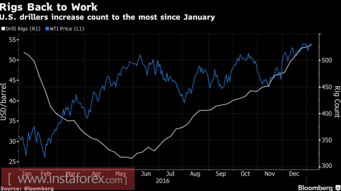 В качестве фундаментального фона для назревающей коррекции могут выступить не только сообщения о неожиданном росте добычи или экспорта в странах-участницах венского соглашения, но и увеличение числа буровых установок в Штатах и других государствах. Так, «медвежьим» фактором для Brent и WTI является информация о росте декабрьского показателя в Стране кленового листа со 173 до 209. В США число буровых установок от Baker Hughes продолжает увеличиваться десятую неделю подряд, достигнув отметки 529, максимальной с декабря 2015. В таких условиях прогноз Goldman Sachs, предусматривающий рост американской добычи на 225 тыс. б/с в период между четвертым кварталом 2016 и октябрем-декабрем 2017, выглядит вполне логично. В этом контексте вопросы о способности рынка черного золота выйти на баланс за счет сокращения объема добычи в размере около 1,8 млн б/с будут возникать все чаще и чаще, заставляя инвесторов отдавать предпочтение сворачиванию длинных позиции по Brent и WTI до появления новых драйверов.