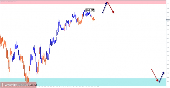 Пояснения к рисунку: На графике отмечены зоны, рассчитанные по определенной методике как критические уровни, резко повышающие вероятность смены направления движения. Чем ближе направление стрелки к цене на рисунке, тем ранее ожидается движение инструмента в отмеченную сторону. Сплошной фон стрелок демонстрирует ожидаемое движение, пунктирный - вероятное.