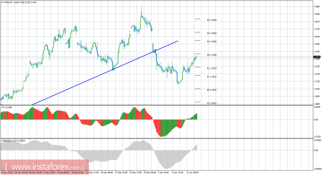 Анализ природного газа за 13 января показывает, что цена продолжает коррекционное движение, о чем сигнализируют оба индикатора. На данный момент актуально нисходящее движение с целями уровни поддержки R1 – 3,2970 и S1 – 3,2030, если цена отскочит от 3,4480. Целями для продолжения восходящей коррекции выступают уровни 3,6000 и 3,6940, если цена преодолеет 3,4480. Цена закрепилась ниже восходящей линии тренда, поэтому сейчас актуальными являются ордера на продажу, а тенденция изменилась на нисходящую. Нисходящей линии тренда на данный момент нет. Индикатор Awesome показывает локальное восходящее движение, последний закрытый бар окрашен в зеленый цвет. OsMA также направлен вверх, что сигнализирует о восходящем движении цены на газ и в более долгосрочном плане. Отскок цены от 3,4480 может засвидетельствовать возобновление движения вниз.