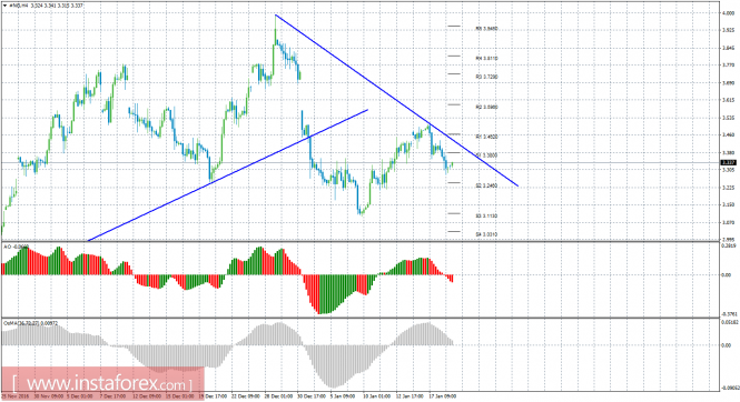 Анализ природного газа за 19 января показывает, что цена возобновила движение вниз, построена новая нисходящая линия тренда. На данный момент актуально нисходящее движение с целями уровни поддержки S2 – 3,2460 и S3 – 3,1130, если цена останется ниже 3,3800. Целями для начала восходящей коррекции выступают уровни 3,3800 и 3,4620, если цена отскочит от 3,2460. Новая нисходящая линия тренда поддерживает торгующих на понижение и делает актуальными шорты. Индикатор Awesome показывает локальное нисходящее движение, последний закрытый бар окрашен в красный цвет. OsMA также направлен вниз, что сигнализирует о нисходящем движении цены на газ и в более долгосрочном плане. Отскок цены от 3,2460 может спровоцировать возобновление коррекционного движения.