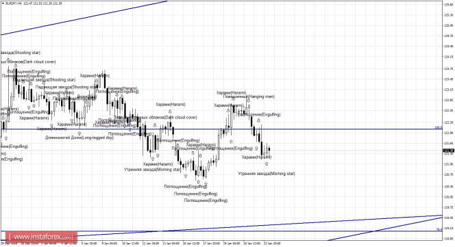Бычья формация «Харами», образовавшаяся на 4-часовом графике, не позволила паре начать рост после образования медвежьей свечной формации «Поглощение», падение котировок продолжилось. А вот бычья формация «Утренняя звезда» позволила выполнить разворот в пользу валюты ЕС и начать рост в направлении коррекционного уровня 100,0% - 122,00. Образование 24 января медвежьей формации позволит трейдерам рассчитывать на разворот в пользу валюты Японии и возобновление падения в направлении уровня коррекции 76,4% - 119,06. Такая формация будет коррекционной. Отбой котировок от уровня Фибо 100,0% аналогично сработает в пользу японской валюты