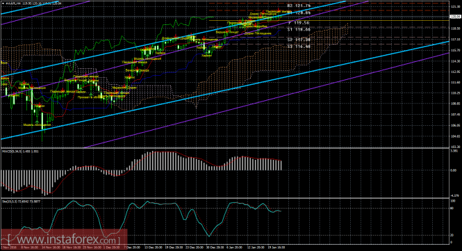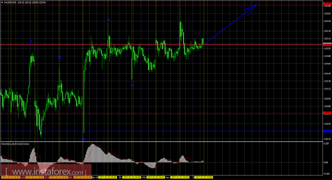 На 15-минутном графике рекомендуется рассматривать ордера на покупку с целью 120,84, при закреплении цены выше 120,02 (Тенкан-сен), ордером Stop Loss ниже 120,02 и при направленном вверх MACD.