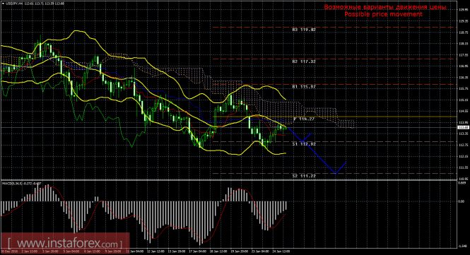 Анализируя курс пары доллар/иена на рынке Форекс 25 января, видим, что цена начала новый виток восходящей коррекции, о чем просигнализировал индикатор MACD. Текущий сигнал на продажу является подтвержденным и сильным, так как Чинкоу Спан закрепилась ниже графика цены, а цена располагается ниже облака Ишимоку, поэтому сейчас целью для нисходящего движения является первый уровень поддержки 112,92, который уже был отработан. Если этот таргет будет преодолен, то новой целью будет выступать второй уровень поддержки 111,22. Нисходящее движение актуально до тех пор, пока цена находится ниже критической линии Киджун-сен (114,05), если цена уйдет выше Киджун-сен, то «мертвый крест» будет поставлен на грань отмены, нисходящее движение будет отменено, восходящее движение сможет попытаться продолжиться с целью первый уровень сопротивления 115,97, а короткие позиции потеряют свою актуальность. Чинкоу Спан находится ниже графика цены, что является подтверждением текущего «мертвого креста» и означает «медвежье» настроение участников рынка по паре доллар/иена. Боллинджер Бандс показывает продолжение нисходящего движения, полосы немного расширяются и направлены вниз, поэтому сейчас на рынке рекомендуется рассматривать варианты шортов. MACD развернулся вверх, сигнализируя о текущем коррекционном движении, если индикатор сменит направление на нисходящее, это укажет на окончание витка коррекционного движения. Отскок цены от линии Киджун-сен также может спровоцировать возобновление движения вниз.