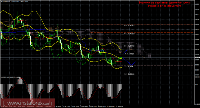 25 января пара доллар/франк отскочила от первого таргета 0,9961 и начала корректироваться с целью критическая линия. Текущий «мертвый крест» подтвержденный и сильный, так как линия Чинкоу Спан находится ниже графика цены, а цена располагается ниже облака Ишимоку. Сейчас целью для нисходящего движения является первый уровень поддержки 0,9961, который уже был достигнут. При преодолении первой цели, новым таргетом для движения вниз станет второй уровень поддержки 0,9908. Нисходящее движение имеет перспективы до тех пор, пока цена находится ниже линии Киджун-сен (1,0040), если цена уйдет выше этой линии, то «мертвый крест» будет ослаблен, нисходящее движение будет временно отменено, движение вверх сможет продолжиться с целью первый уровень сопротивления 1,0102, а шорты станут не актуальными. Чинкоу Спан находится ниже графика цены, что является подтверждением текущего сигнала на продажу и означает «медвежье» настроение участников рынка по валютной паре доллар/франк. Боллинджер Бандс показывает продолжение нисходящего движения, полосы не расширяются и направлены вниз, поэтому сейчас на рынке по-прежнему актуальны короткие позиции. MACD развернулся вверх, что сигнализирует о текущем восходящем движении цены, разворот индикатора вниз может засвидетельствовать завершение коррекции. Отскок цены от критической линии также может засвидетельствовать окончание витка восходящей коррекции.