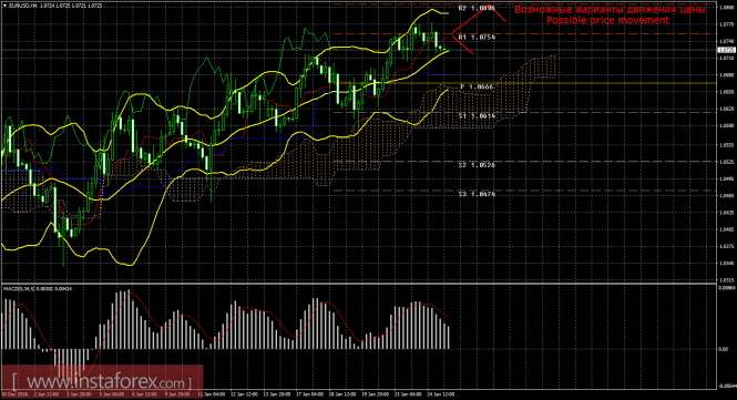 Анализ рынка Форекс по паре евро/доллар за 25 января показывает, что цена совершила несколько попыток преодолеть первый таргет, все безуспешные. Текущий сигнал на покупку подтвержденный и сильный, так как Чинкоу Спан находится выше графика цены, а цена располагается выше облака Ишимоку. На данный момент целью восходящего движения является первый уровень сопротивления 1,0754, который остается не преодоленным. В случае преодоления первого таргета, новой актуальной целью будет выступать второй уровень сопротивления 1,0806. Восходящее движение будет актуальным до тех пор, пока цена находится выше линии Киджун-сен (1,0680), если цена закрепится ниже критической линии, то текущий «золотой крест» будет вновь ослаблен, восходящее движение будет отменено, движение вниз сможет попытаться продолжиться с целью первый уровень поддержки 1,0614, а лонги станут временно не актуальными. Чинкоу Спан находится выше графика цены, что является подтверждением текущего «золотого креста» и означает «бычье» настроение трейдеров. Боллинджер Бандс показывает продолжение восходящего движения, полосы не расширяются и направлены вверх, поэтому сейчас на рынке рекомендуется рассматривать ордера на покупку. MACD развернулся вниз, что свидетельствует о нисходящем движении цены. Если индикатор развернется обратно вверх, это просигнализирует об окончании нисходящей коррекции. Отскок цены от критической лини также может спровоцировать возобновление восходящего тренда.