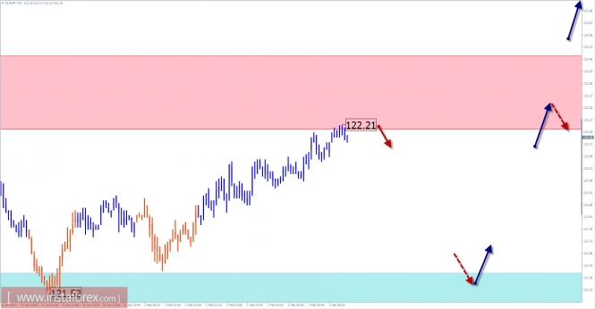 Пояснения к рисунку: На графике отмечены зоны, рассчитанные по определенной методике как критические уровни, резко повышающие вероятность смены направления движения. Чем ближе направление стрелки к цене на рисунке, тем ранее ожидается движение инструмента в отмеченную сторону. Сплошной фон стрелок демонстрирует ожидаемое движение, пунктирный - вероятное.