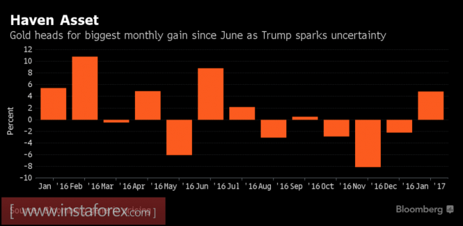 По итогам января золото продемонстрировало лучшую динамику с июня, когда умами инвесторов владел Brexit, зализав часть потерь, понесенных в четвертом квартале. Он стал для драгметалла худшим за последние три года. Еще до победы Дональда Трампа на президентских выборах в США аналитики дружно прогнозировали взлет XAU/USD на фоне неопределенности, связанной с политикой республиканца, спустя несколько недель эти прогнозы стали воплощаться в жизнь, хотя после голосования золото заставило изменить мнение. Вера в ускорение американских ВВП и инфляции и связанное с ними ужесточение денежно-кредитной политики ФРС опустили цены к области 10-месячного дна.