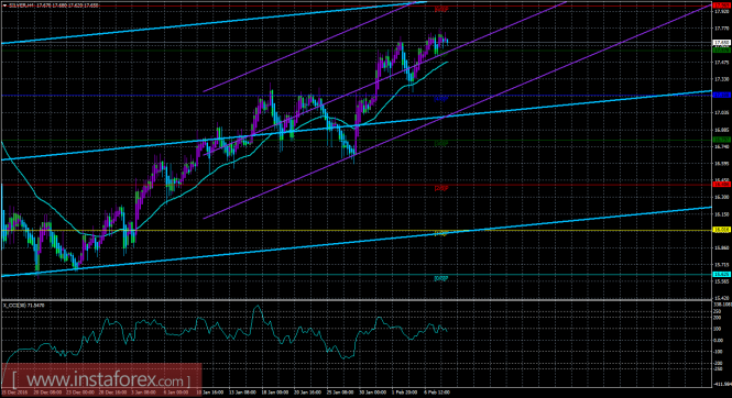 Из анализа серебра 8 февраля следует, что цена в целом продолжает восходящее движение, но оно немного ослабло. Старший канал развернулся вверх, что свидетельствует о восходящем направлении движения глобального тренда. Младший канал также направлен вверх, что означает восходящее движение и в менее долгосрочном плане. В данный момент цена находится выше мувинга и выше уровня Мюррея «5/8», что делает более вероятным продолжение восходящего движения. Первой целью для движения вверх сейчас является уровень Мюррея «6/8» - 17,969. Если цена преодолеет этот уровень, то новой целью будет выступать уровень Мюррея «7/8» - 18,359. Скользящая средняя направлена вверх, а цена располагается выше нее, что сигнализирует о текущем восходящем направлении движения. Короткие позиции можно будет рассматривать не раньше закрепления цены ниже мувинга и разворота вниз хотя бы одного канала линейной регрессии. Хайкен Аши окрасил последние бары в фиолетовый цвет, что сигнализирует о внутридневном движении вверх, таким образом, ордера на покупку сейчас актуальны. Окрас 1-2 баров в голубой цвет засвидетельствует виток нисходящей коррекции. Индикатор CCI находится около уровня 100, что сигнализирует о наличии слабой перекупленности инструмента.