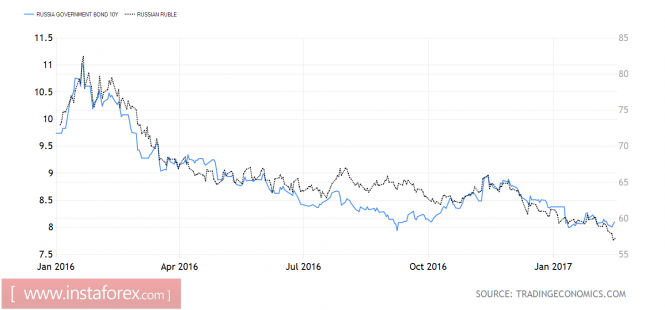 По итогам января инфляция в РФ составила 5%, сделав еще один уверенный шаг в направлении таргета 4%. Тем не менее, инфляционные ожидания остаются повышенными, что сдерживает ЦБ от снижения ключевой ставки 10%. Тем более что практика валютных и вербальных интервенций теоретически должна ослабить рубль. Пока он предпочитает отыгрывать внешний позитив, в том числе нежелание доллара США укрепляться, несмотря на ряд позитивных для последнего факторов. В частности, Джанет Йеллен заявила, что ставка по федеральным фондам будет повышена на одном из ближайших заседаний FOMC, CPI ускорился до 2,5%, максимальной отметки с 2014, а розничные продажи превысили ожидания экспертов Reuters. Срочный рынок увеличил вероятность мартовской монетарной рестрикции ФРС с 8% до 31%, а пара EUR/USD не может закрепиться ниже основания 6-й фигуры. Вполне возможно, что инвесторы беспокоятся по поводу скорых вербальных интервенций со стороны Белого дома.