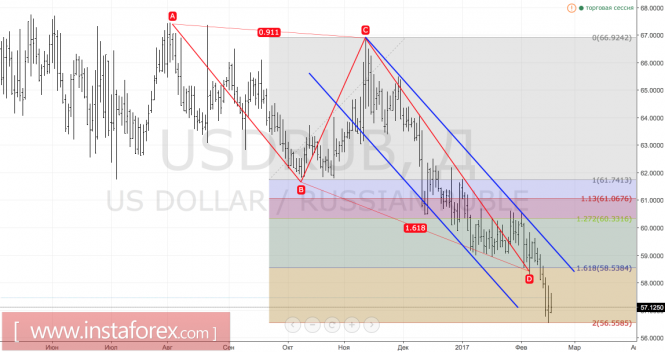Технически котировки USD/RUB достигли таргета на 161,8% по паттерну AB=CD, после чего последовал закономерный отскок. Для продолжения южного похода требуется преодоление поддержки на 56,55, однако наиболее вероятным сценарием развития событий видится консолидация в диапазоне 56-60.