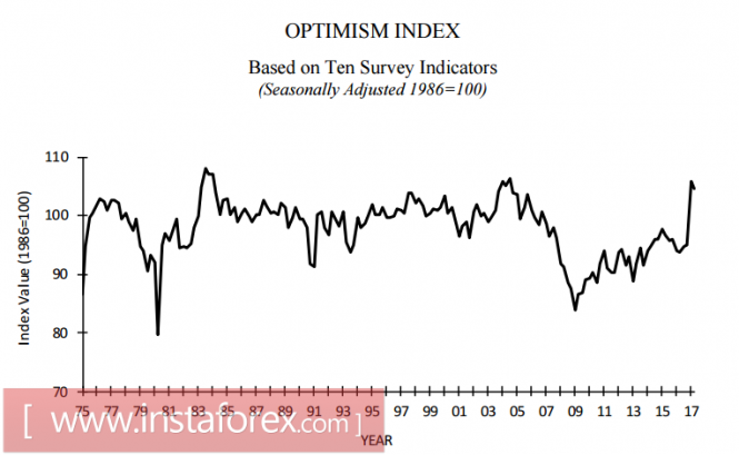 Индекс делового оптимизма от NFIB, отражающий уровень доверия в малом бизнесе, снизился на 0.2п, до 104.5п в апреле, сохранив, тем не менее, высокий импульс. Индекс резко вырос на фоне победы Трампа в ноябре 2016 года, достигнув исторически максимальных показателей за 6 месяцев, лучше он выглядел только в 1983 году, после того как был найдет выход из рецессии энергетического кризиса. На текущий момент, несмотря на небольшое снижение, ожидания бизнеса имеют только одно направление – вверх.