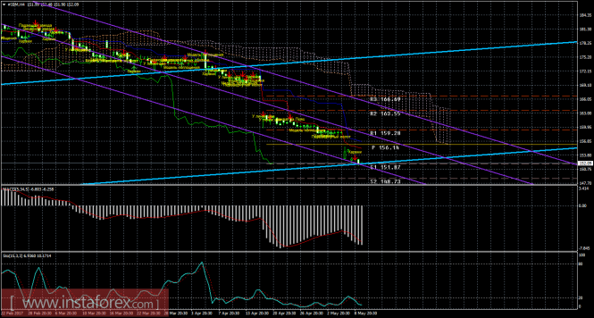 На младшем графике рекомендуется рассматривать ордера на продажу с целью 148,73 при открытии ниже 155,28 (Тенкан-сен), ордером Stop Loss выше 153,05 (максимум предыдущей сессии) и при направленном вниз MACD.