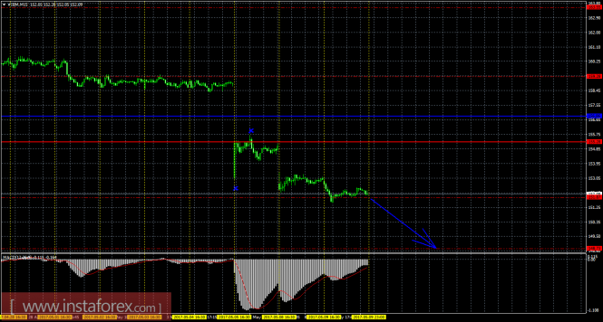 Анализируя график акций компании IBM, видно, что цена продолжает нисходящий тренд и достигла первый уровень поддержки. Старший канал линейной регрессии направлен вверх, младший – направлен вниз, что разрешает рассматривать короткие позиции на рынке. Текущий «мертвый крест» – сильный (так как цена располагается ниже облака Ишимоку), поэтому ордера на продажу актуальны и по этому признаку. На данный момент целью для нисходящего движения является уровень поддержки 151,87, который уже достигнут. Следующим таргетом для движения вниз выступает 148,73. Сформировалась медвежья модель «Харами», которая сигнализирует о возможном продолжении движения вниз. Индикатор MACD развернулся вниз, сигнализируя о текущем нисходящем движении. Однако, цена может в любой момент вновь начать разряжаться, среагировав на любое не понижение цены. Стохастик находится в области перепроданности, что свидетельствует сейчас о нисходящем настроении на рынке и отсутствии коррекции. Отскок от первого таргета может спровоцировать коррекционное движение. Младший таймфрейм детализирует картину старшего таймфрейма. На младшем графике видно, что цена отработала первый таргет 151,87. Короткие позиции, таким образом, остаются актуальными с целью уровень поддержки 148,73. Разворот индикатора MACD вниз укажет на завершение витка локальной коррекции. Обновленный нижний фрактал говорит в пользу продолжения нисходящего движения.