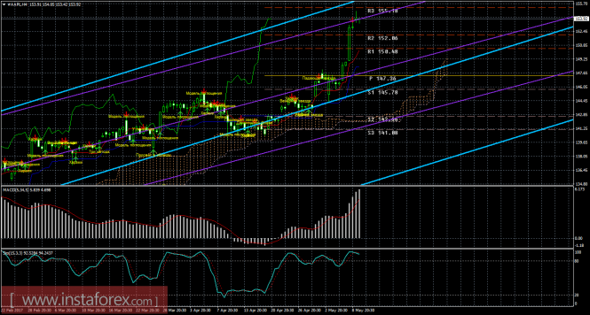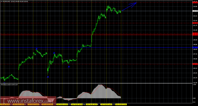 На 15-минутном графике рекомендуется рассматривать ордера на покупку с целью 155,18 при закреплении цены выше 152,06, ордером Stop Loss ниже 152,06 и при направленном вверх индикаторе MACD.
