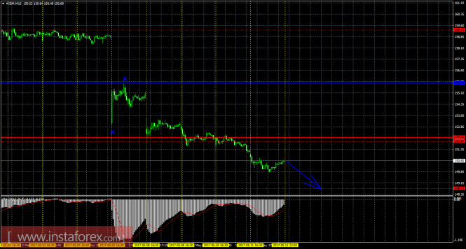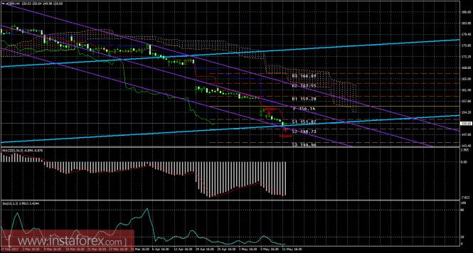 На младшем графике рекомендуется рассматривать ордера на продажу с целью 148,73 при открытии ниже 151,87, ордером Stop Loss выше 151,87 и при направленном вниз MACD.