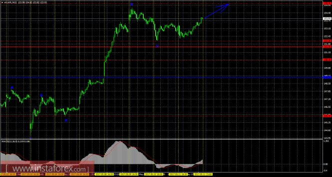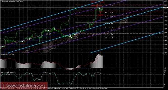 На 15-минутном графике рекомендуется рассматривать ордера на покупку с целью 155,18 при закреплении цены выше 152,06, ордером Stop Loss ниже 152,06. Разворот MACD вниз укажет на коррекцию.