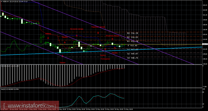 Анализируя график акций компании IBM, видно, что волатильность инструмента продолжает оставаться почти нулевой, ниже линии Киджун-сен цене уйти не удалось. Старший канал линейной регрессии направлен вверх, младший – направлен вниз, что разрешает рассматривать длинные позиции на рынке. Текущий «золотой крест» – слабый (так как цена располагается ниже облака Ишимоку), поэтому ордера на покупку не актуальны по этому признаку. На данный момент целью для восходящего движения является первый уровень сопротивления 153,70. Следующим таргетом для движения вверх выступает 154,93. Новых свечных моделей на данный момент нет. Индикатор MACD вновь направлен вверх, сигнализируя о текущем восходящем движении. Разворот индикатора вниз укажет на возможное возобновление нисходящего движения. Стохастик покинул область перепроданности, что свидетельствует сейчас о неопределенном настроении на рынке. На младшем графике видно, что цена на прошлой торговой сессии закрепилась выше линии Киджун-сен, но по-прежнему располагается ниже Тенкан-сен. Таким образом, длинные позиции с целью уровень сопротивления 153,70 актуальны, но только после закрепления цены выше Тенкан-сен. Последний нижний фрактал не был обновлен, что говорит в пользу возобновления восходящего движения.